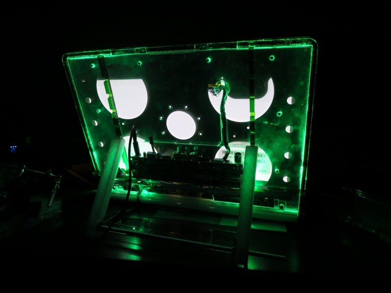 When turned on and running, PEMv3 was already pretty brightly lit: the fluorescent back light for the panel emits light in many other directions. It is visible from multiple locations on the side, and also visible across most of the back side. Adding these LEDs (green, to match the 6mm acrylic used in the enclosure) is fairly redundant but succeeded in making everything even brighter.