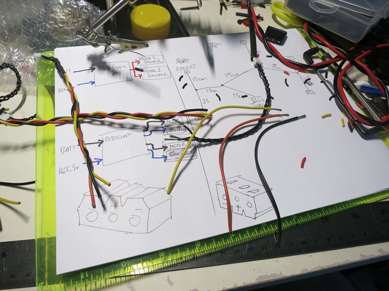 The topology chosen for the first build is to mimic the topology of each rocker-bogie suspension assembly. When laid out it looks like a tree branch. This involves making a Y-shaped solder joint at each branching point, a task that’s just outside my soldering skill comfort zone. The solder joints look terrible to start but each one is a practice opportunity. By the end, the joints are halfway respectable. Or at least, not painful to look at.