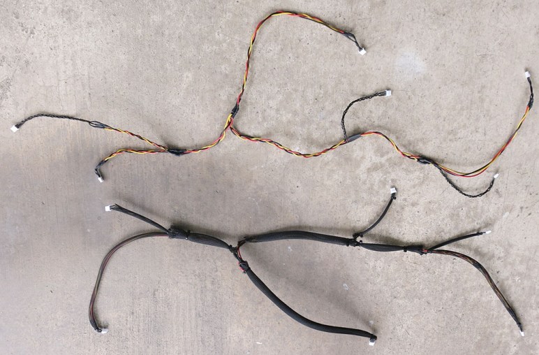 Here are the two wiring harnesses (one for each side of the rover) in the middle of this wire management project. On top is the ‘before’ picture showing all its chaotic awkwardness, and below is the ‘after’ where braided sleeves have almost completely masked all the flaws. And with the eyesore factor eliminated, we can put them back on Sawppy’s chassis.