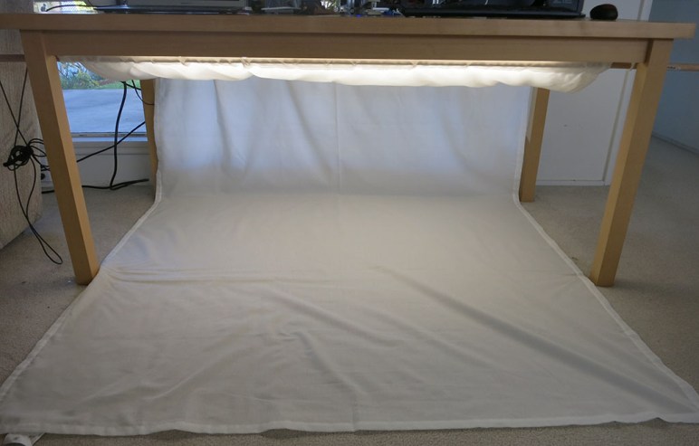 Aside from the curtain rods sticking conspicuously out the side, all the elements of my tiny photo studio can be stowed out of the way. The white fabric is a curtain from IKEA, mounted to the rod closest to the camera and draped over the far side rod.