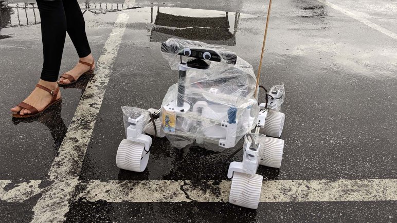 This custom-fitted raincoat only covered Sawppy’s equipment bay. To protect the rest of Sawppy, sandwich bags were placed over four corner steering motors, and a hotel shower cap was put over Sawppy’s head. Everything wrapped up nicely around Sawppy’s neck with a strip of velcro, again from [Jasmine]’s workshop. This compact arrangement was lighter and more compact than an umbrella when folded. And when deployed, Sawppy could go outdoors and romp in the rain.