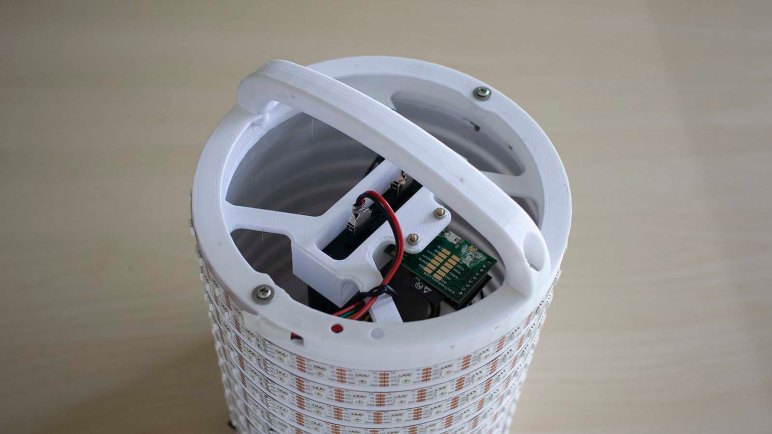 The new LED helix top piece gained responsibility for keeping the battery pack in place in addition to aligning the Pixelblaze with LED geometry. The old top piece also provided a few simple handles, but the new top piece has been relieved of that task: there will be a more robust dedicated handle for this LED chassis instead.