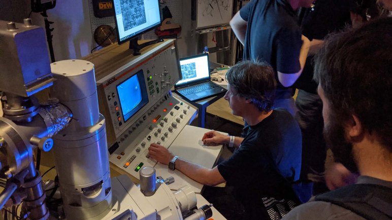I was also surprised at how feedback is visible immediately. It was explained to me the whole machine is a very analog process. The path from the electron beams striking the sample to picture on operator console CRT has no digital frame buffers or processing inserting delay. Every once in a while an image is recorded to the adjacent laptop, and that process consumes several seconds, but the knob-twiddling is effectively instantaneous on CRT as are interactions with the sample. I saw some small specs of dust dance around and initially thought it was due to air movement, but then I learned the sample is held in a vacuum. What is moving the dust? The electron beam!