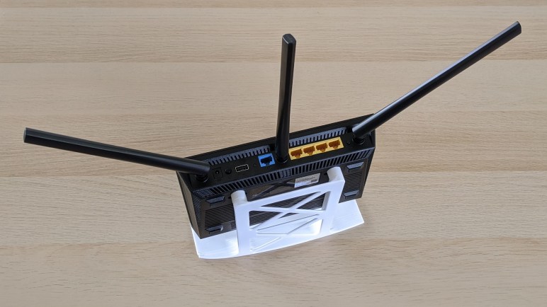 For better space utilization, I wanted the router to stand vertically. But in the interest of providing more cooling, I didn’t want it to be wall-mounted against an airflow-constricting surface. Making a vertical stand became a quick-and-dirty design and 3D printing project.