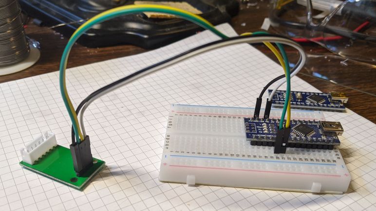 I didn’t perform the same JST-XH replacement for the digital data connection, because I wanted the flexibility to use jumper wires to connect this board to something I can use to read data from a HX711. Looking around for software libraries online, I found a HX711 library for Arduino so I pulled out my prototyping breadboard with an Arduino Nano already on board. This is as good of a starting point as any.