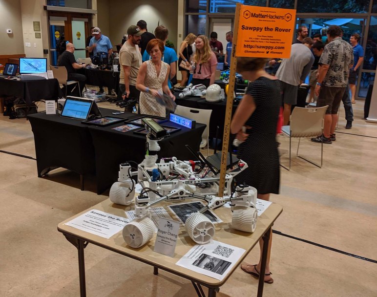 [Headline image: Sawppy at MatterHackers Modern Creators event. Behind Sawppy is Tamara @tlynnr85 promoting her Seekers of Science project.]