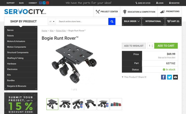 The littleBits Space Rover is a cute little thing, but with only two wheels it bears little resemblance to real life Martian robot explorers. Moving a little bit higher on the fidelity scale, there are some robots out there with six wheels arranged in a rocker-bogie geometry. A representative of this breed is the ServoCity Bogie Runt rover.
