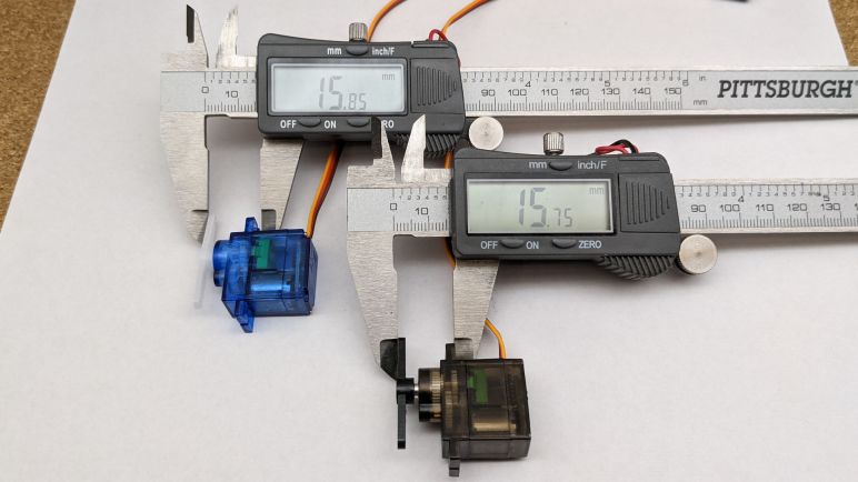 But to end on a bit of happy news, it seems like there’s one final de-facto standard dimension that all these designs adhere to: despite the variation between servo horn thickness and mounting tab thickness, it appears that the distance between the bottom of the mounting tab to the top of the servo horn is fairly consistent. Again there’s no guarantee all the micro servos out there would adhere to this convention, but at least it gives me a starting point on mechanical design as I move on to look at the electronics within.
