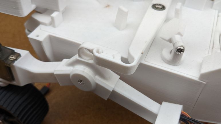 The potential for breakage highlights another problem with tightly integrated designs: if the living hinge breaks, the entire component has to be reprinted. I’m still undecided about using 3D-printed living hinges, so there will be a few more rounds of experimentation to gather more data. But if I want to use living hinges printed from plastic filament not intended to be flexible, I should at least change the design to be a multi-piece part. If the living hinge itself is a smaller separate component, it can be reprinted quickly for replacement in case of breakage. Which I don’t think is a huge risk when rolling around, but unintentional sharp jolts happen a lot when I am trying to open up this rover’s equipment bay.