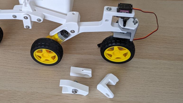 As part of this change, the C-shaped bracket to prevent bogie over-rotation is no longer a simple clip-on piece of plastic as it was on MSB1 and MSB2. It is now a structurally important part of the rocker-bogie joint, supporting the weight of outer bogie bearing. There’s a good chance this bracket on MSB3 is bulkier than necessary, but I wanted to verify the idea works before slimming it down. It’s already taken way more effort than I thought it would take to get this point.