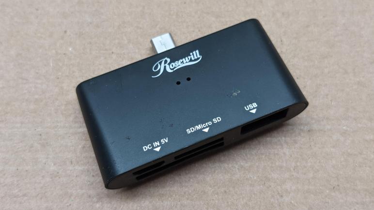 Based on all the slots on one side, this is clearly a multi-format flash media reader/writer. The other end was a little more interesting, as it is a USB micro-B plug instead of the usual socket. The presence of the plug implies this was designed for use with USB OTG devices such as an Android phone, allowing them to read and write flash cards. Aside from a few labels for the various types of flash media, there was only the “Rosewill” brand logo. I found no model number or serial number printed on the enclosure. Searching for “Rosewill USB OTG” retrieved information on many products. The closest match based on pictures is the RHBM-100-U2.