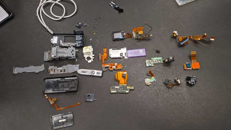 The sun had since set for compact point-and-shoot digital cameras. Some people still have them and list them on eBay as “rare vintage digital camera” asking hundreds of dollars for them. Feh! Taking one apart is more fun. I brought it to the January 2020 session of Disassembly Academy at Supplyframe Designlab and a team went to work. I was running around as a co-host of the event (taking a few pictures along the way) and as much as I enjoyed sharing my love of taking things apart to see what made them tick, I was a little sad I couldn’t see every minute of this teardown.