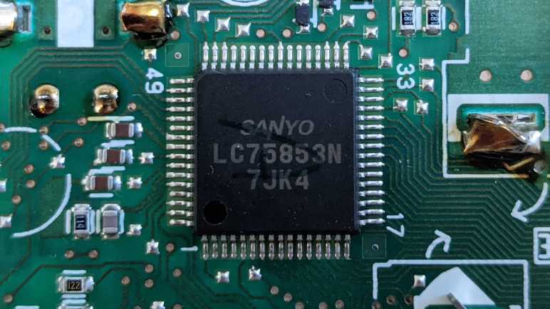 Seeking another source, I searched for this chip at Digi-Key. Their database did not list this exact item, but there were a few other LC7583 variants listed as “Obsolete” and without datasheet. I ultimately resorted to going through one of those internet sites that archive old PDFs. I find it annoying to have to wade through a bunch of “Click here to download!” ads that try to trick you into downloading irrelevant things that may or may not hide malware. It’s always a hunt for the actual link to the PDF we want, which may or may not have been modified maliciously. But eventually I ended up with Sanyo datasheet for “LC75853NE, 75853NW” which is hopefully close enough. The PDF was also slathered with the annoying site’s watermark, but I hope that’s all the annoyances in that file.