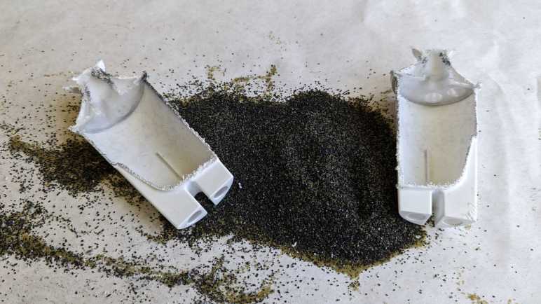Matching Wikipedia description, I see two different types of material within. I would guess the angular black pieces are activated carbon, and the round translucent yellow-green balls are the ion-exchange resin. And unfortunately, because the action of sawing the cartridge in half created a lot of sawdust from the enclosure’s white plastic, it was not possible to distinguish anything that might be hard water deposit on the filter material.