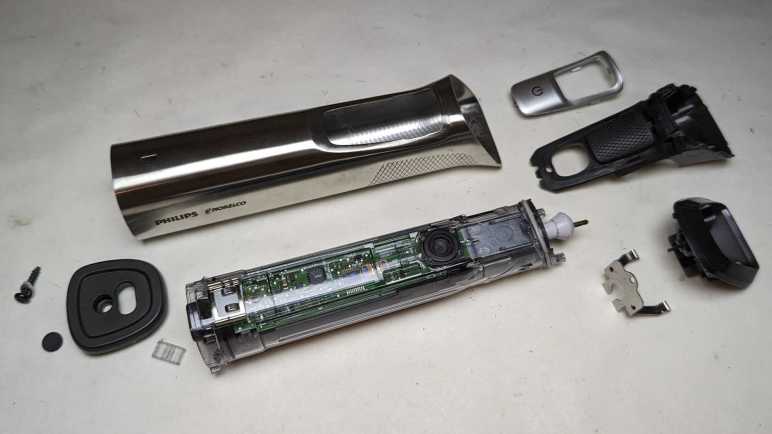 The AC adapter uses this vaguely B-shaped plug that I haven’t seen anywhere else, possibly proprietary to Philips/Norelco. Next to the charging port at the base is a Torx-headed screw hidden under a rubber cover. That looks like a good place to start.