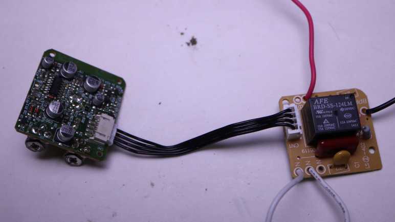 At a high level, it looks like one board handles the 120V AC power with a relay and the other board handles sensing and sensor logic. Four wires connect between them.
