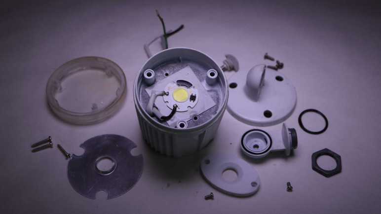 But if I don’t care about weatherproofing, the front and back of the pod are both held by easily accessible fasteners. I can replace one or both of those pieces while still leaving the large center heat sink + LED COB assembly intact. For the back, I could bolt it to my own mounting mechanism tailored for the needs of the project. For the front, I could put something in front of the LED instead of the current piece of weathered and yellowed clear plastic. Perhaps a lens assembly to focus the beam?