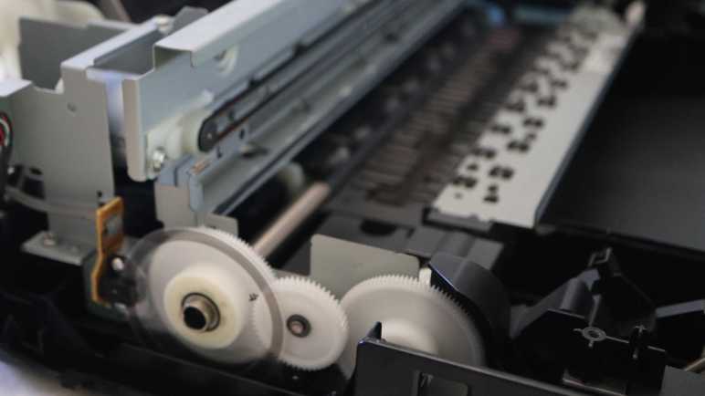 The motor output shaft has a small black plastic gear, almost blending into the shadows. I traced only two wires leading into this area, implying it’s a brushed DC motor down there. Some of the older inkjet printers I took apart earlier used stepper motors for open-loop control. In this printer, precise control is accomplished with a closed-loop control system: the gear on the left has an encoder wheel and a sensor reading its motion providing feedback.