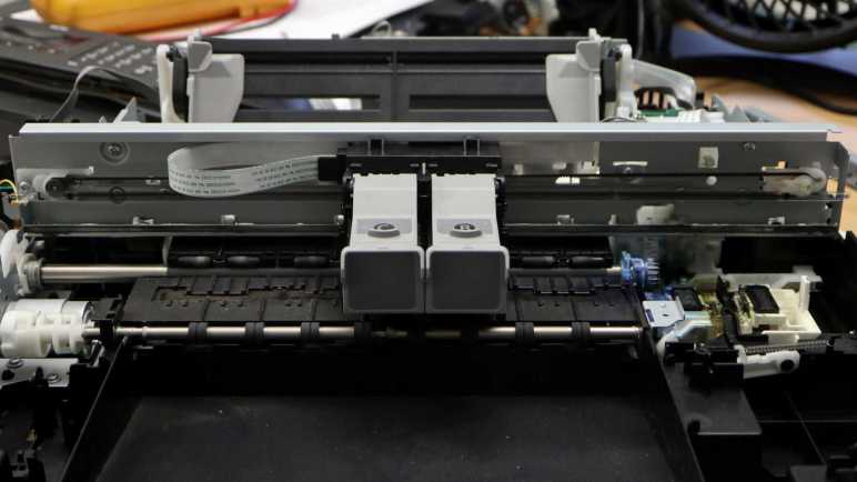 The most obvious target for starting phase 3 is the print carriage assembly, or “the X-axis” in my mind. Sitting on top of all remaining mechanical bits, it carries the two ink cartridges (“C” for colors cyan/magenta/yellow and “B” for black) with their integrated print heads across the printing area as well as a print head maintenance/parking area to the right. After seeing how the paper feed motor was linked to many other mechanisms in addition to feeding paper, I had expected to see similar clever multi-use of the X-axis motor and surprisingly didn’t find additional gears.