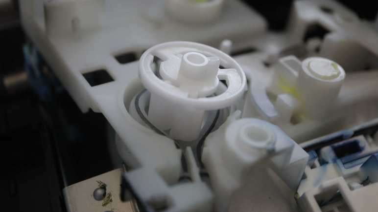 A standard peristaltic pump works in both directions, but here we don’t want to pump ink or even air back into the maintenance tray. This pump rotor is designed so it only pumps in one direction. The trio of rollers each sit in their own spiral track. When the rotor is rotating in the pumping direction (counter-clockwise in picture above) the rollers are pushed outwards so they press on the tubes and do their thing.