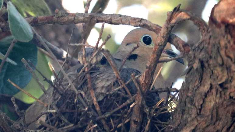 Over the following weeks I checked in on mama bird daily. She was not happy with my tree trimming and erected additional camouflage to mitigate my damage. That made it more difficult to see her but hopefully provided some protection against predators. I hadn’t trimmed the tallest branches yet so she still had decent overhead coverage against other birds, but I was worried about cats in the neighborhood who could now better see the nest from ground level.