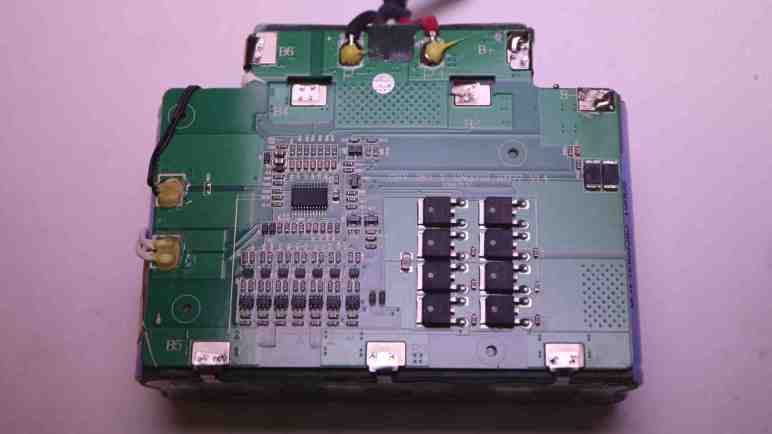 Thankfully this battery pack enclosure was held together with screws, so I could open it up for a look inside. Aha! It is not a raw package of 14 cells in 7S2P configuration, they are under care of a battery management system (BMS) board. Similar to the 3S BMS board I had played with, but this one handles 7S cells. There are spot-welded tabs to monitor voltage of each 2P group. Some of those spot welds are… not textbook, let’s say. But they have continuity and they let me measure voltage. The situation looks even better here. Each 2P group (B- to B1, B1 to B2, etc. through B6 to B+) ranged from 1.1V to 1.9V. The pack as a whole is actually hovering around 10V across its “B+” and “B-” terminals. This is still over-discharged but in far better shape than 3V I measured across output terminals. (P+ and P-)