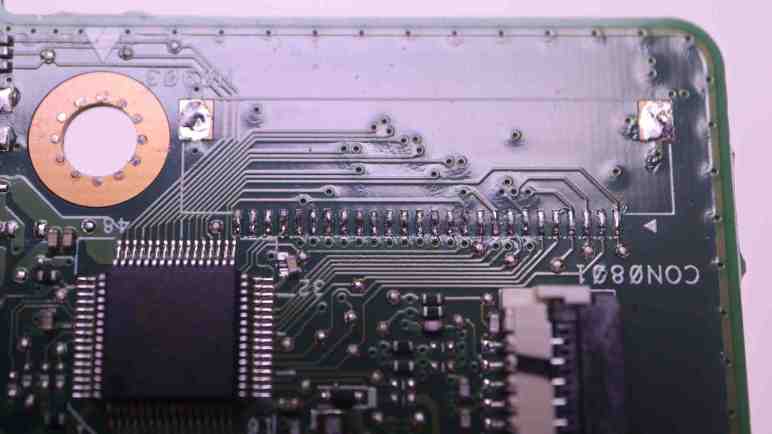Looking on the back side, I see very few wires and they are mostly consistent with wires jumping over other perpendicular wires on the front. Not all of the vias lined up with traces I could see, which would be consistent with a circuit board with more than two layers. Though there are traces I couldn’t see, I think it is possible all 24 wires are connected directly to the chip adjacent to the now-unsoldered connector.