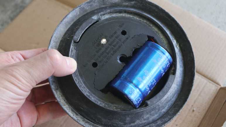 Given the limited expected lifespan of NiMH battery in this application, I thought it was a good opportunity to play with a supercapacitor. A relatively new branch of the capacitor family tree, they offer several orders of magnitude more energy storage capacity than other capacitor types though still less than commodity batteries. The types I can realistically purchase and play with can comfortably operate at summer heat temperatures, and their maximum voltage of 2.7V has a comfortable margin over solar cell output. Another key capacitor advantage over batteries are their tolerance for high charge and discharge rates, but that’s not important here. Most importantly, prices have dropped enough for me to pick up a batch to play with. I went on Amazon and bought the highest Farad-per-dollar listing I found that day. (*) Once it arrived, I selected another lawn light for this capacitor experiment.
