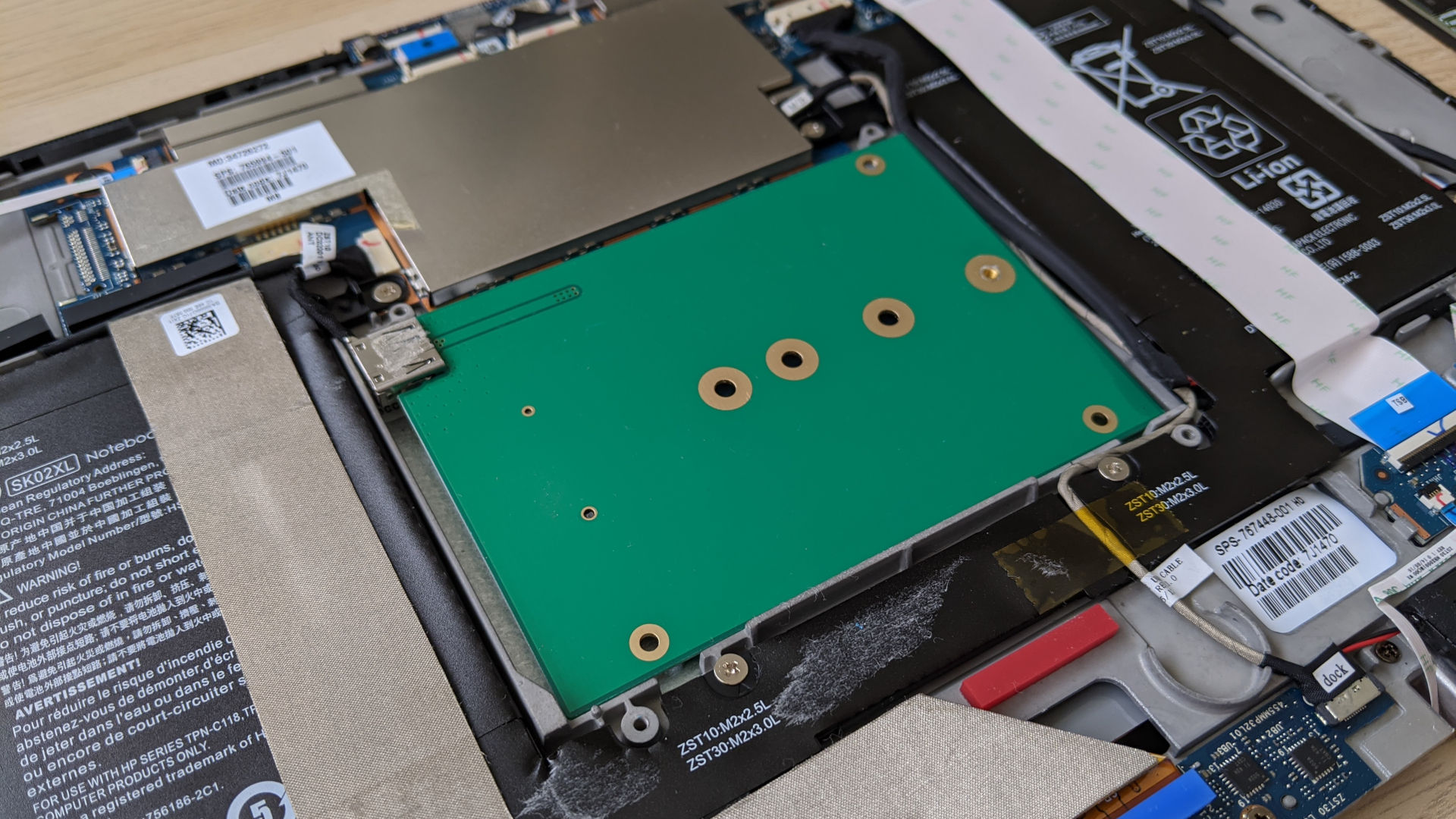 HP Split X2 13-r010dx with SFF-8784 adapter installed close up