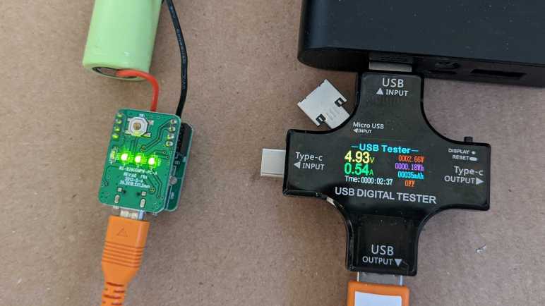 I realized there was a problem when I put the ESP8266 to sleep and noticed charging resumed. This was a surprise. Probing the circuit I found my first problem: there is a pull-up resistor or a voltage divider on board my new buck converter module so that if its enable pin is left floating, it will activate itself as my usual MP1584 module would. This was mildly disappointing, because it meant I might have to unsolder a few resistors to get the behavior I originally wanted, and one of the reasons to buy this module was because I didn’t want to unsolder resisters from my MP1584 buck converter boards. As a short-term hack, I fought the existing circuit by adding a pull-down resistor external to the module. Experimentally it looks like a 10k resistor to ground was enough to do the trick, disabling the buck converter when enable input line is left floating.