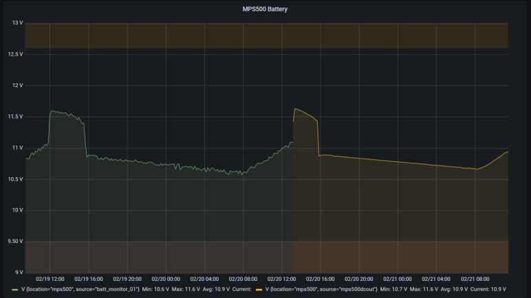 A 1kΩ resistor connects each ESP32 GPIO pin to an LCD pin, and a 330pF capacitor connects each ESP32 GPIO pin to ground. It isn’t quite a straight shot of ten parallel pins, with a two-wide gap on the left (serial communication TX/RX pins) and a single pin gap on the right (GPIO2, which this dev board connected to a blue LED that I’m using as a system heartbeat indicator.) On the far right is a loop of wire connected to the ground plane, so I have a convenient place for my oscilloscope to clip onto.