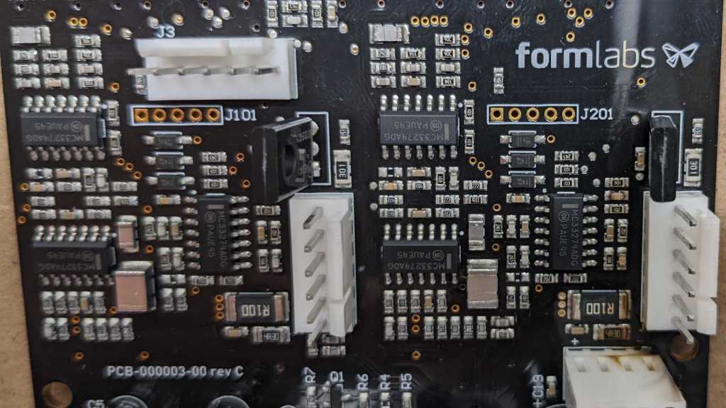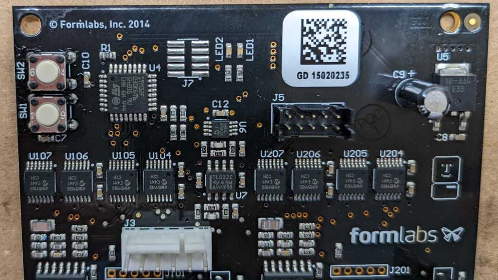 After removing four tiny hex screws I could pull the display circuit board free. (Promptly losing one of four plastic spacers between the circuit board and front panel.) Now I can confirm its blue color came directly from the display and not a tint imparted by front panel plastic window. We also see the circuit board is a FormLabs custom breakout board labeled with: