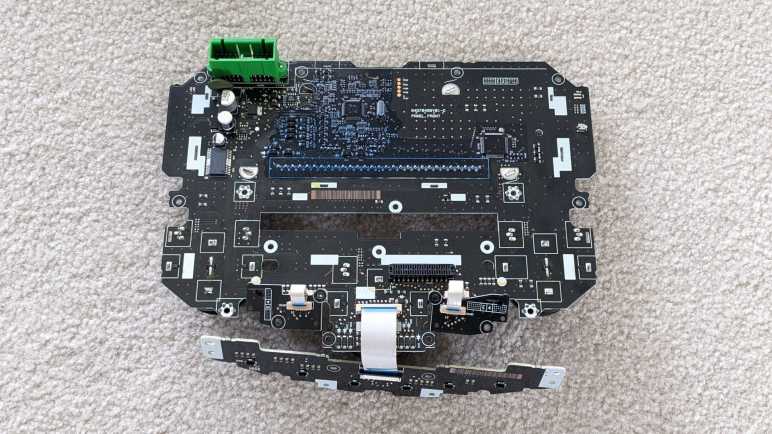 There are ten 7+ segment displays. Four to the left of the spinner, three above, and four to the right. Some of these have additional segments, likely to display specific subsets of the alphabet. That works for static text, but it rules out scrolling text.