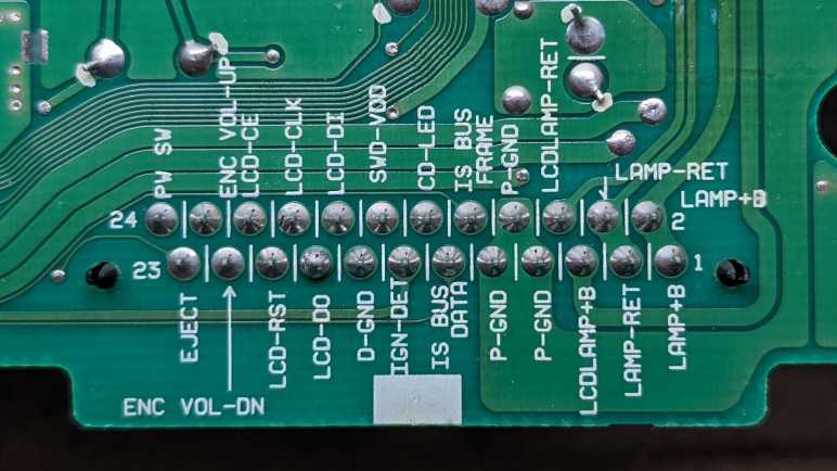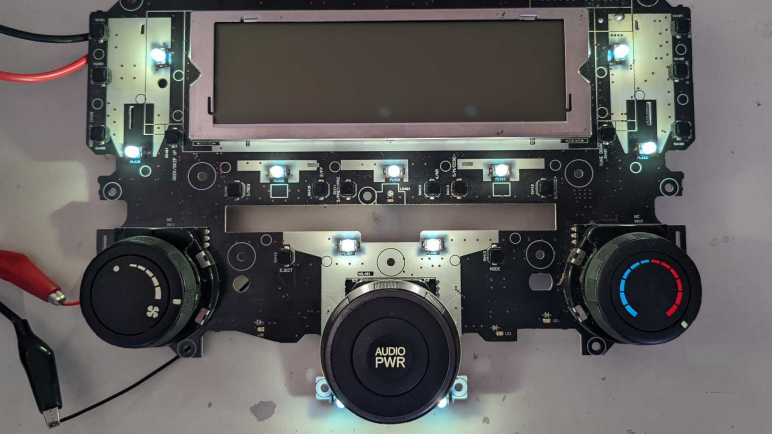 I am at a good stopping point for my exploration of a retired CD player control panel from a Honda Accord. At this point I can interact with all audio control button and knobs, and control what is displayed on its output LCD controlled by Sanyo LC75883 chip. My Arduino sketch toggles through several different modes when I press the “Mode” button (read via LC75883): Turn all segments on, or a “drawing mode” of turning on individual segments selected via the quadrature encoder knob. Very functional, but I wanted to put together something a little flashier before I move on to the next project.