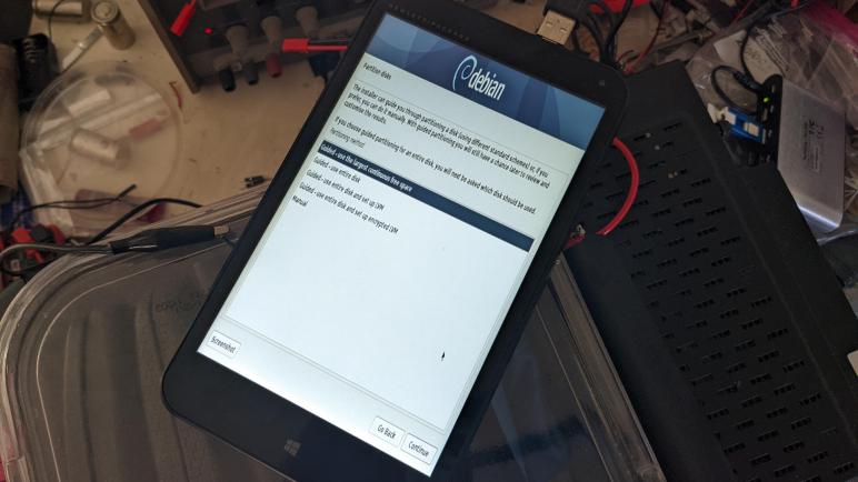 Which reminds me of another fun fact: this machine has only a single USB micro-B port. In order to use USB peripherals, we need a USB OTG adapter. Which is good enough for a bootable USB drive for operating system installation… but then I need to press [Ok] to continue! The usual answer here is to use an USB hub so I could connect both the bootable OS installer and a keyboard. There’s actually no guarantee this would work: it’s not unusual for low-level hardware boot USB to support only root-level devices and not hubs. Fortunately, this tablet supported a hub to connect multiple USB devices allowing bootable USB flash driver for operating system installation to coexist with USB input devices to navigate a setup program.
