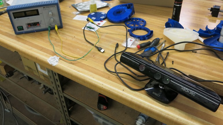 Yes, that is a Xbox 360 Kinect sensor bar taped on top of an office chair. The laptop talking to the Kinect can sit on the chair easily enough, but the separate 12V power supply took a bit more work. I had two identical two-cell lithium battery packs. Wiring those two ~7.4V volt packs in series gave me ~14.8 volts, which fed into a voltage regulator bringing it down to 12V for the Kinect. The whole battery power contraption is visible in this picture taped to the laptop’s wrist rest next to the trackpad.