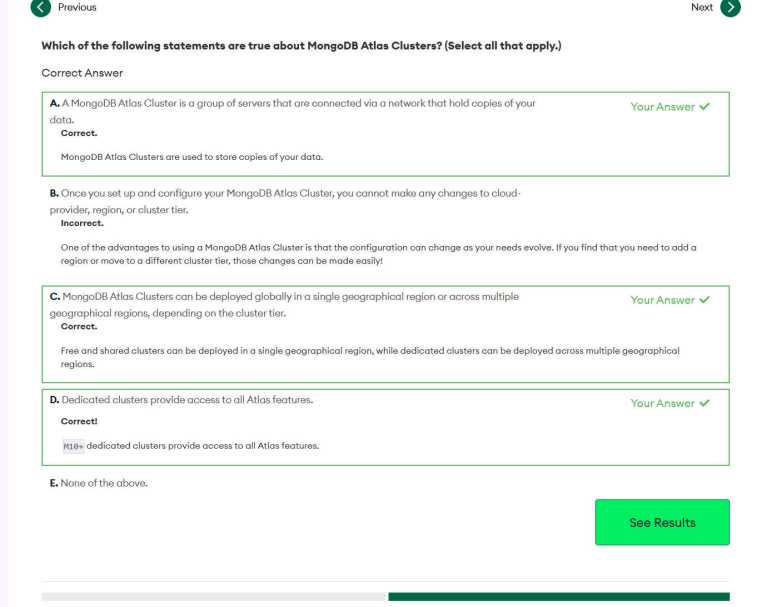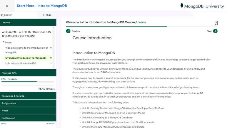 The exercise is “Hello World” level, connecting to a MongoDB instance and listing all available databases. Success means we’ve verified all libraries & their dependencies are install correctly, that our MongoDB authentication is set up correctly, and that our networking path is clear. I thought that was a great starting point for more exercises, and was disappointed that we actually didn’t use our own Node.js environment any further in this course. The rest of the course used the Instruqt in-browser environment.
