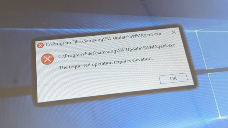 The image at the top of this post is just one example. SWMAgent.exe appears to be some sort of Samsung software update engine (What’s wrong with Windows Update?) and it asks for elevation. If the user declines to grant elevated privileges, the software is supposed to respect that choice and go away. But not Samsung! We see a black border visible around that dialog box, which might look strange at first glance. Windows 10 adds a subtle dark shadow to dialog boxes, why this ugly black thing? It is because we’re not looking at a single SWMAgent.exe dialog box, but a huge stack of of them. Each popping on top of the last, and another one added every minute or so. The thick black border is a result of that subtle dark shading stacked deep and combining, because Samsung would not take no for an answer.