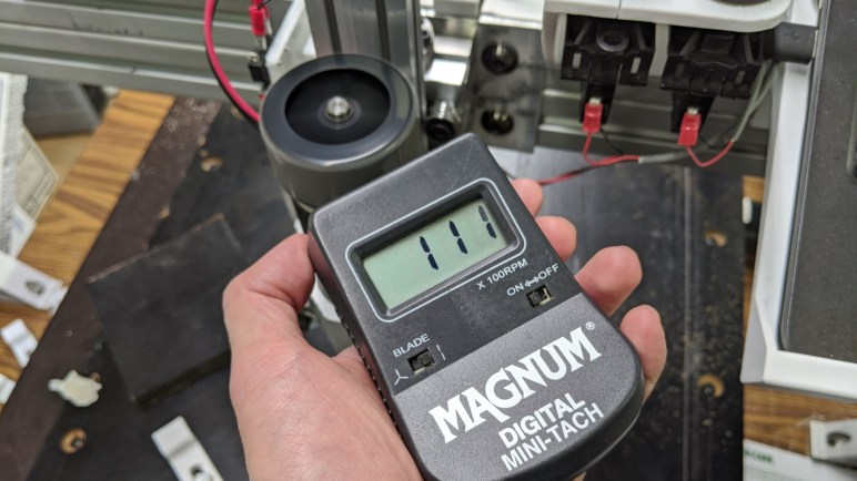 Our cheap ER11 spindle’s product page(*) claimed a maximum speed of 12,000 RPM, but we knew better than to take that at face value. To measure its actual performance, we wanted some sort of non-contact photo tachometer(*). This particular unit was on hand and originally designed for measuring remote control aircraft propeller speeds, and it measured the maximum speed at 11,100 RPM. We’ll use 11,000 RPM for our initial calculations. Later we’ll measure while it is cutting and see how much its speed drops.